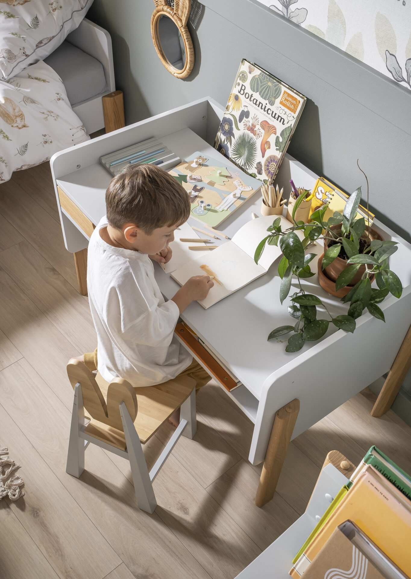 Biurko zostało wykonane z połączenia solidnego MDF z lekkością drewna sosnowego. Do wyboru przygotowaliśmy 4 kolory, tak aby dopasować się do każdego wnętrza dziecięcego pokoju.